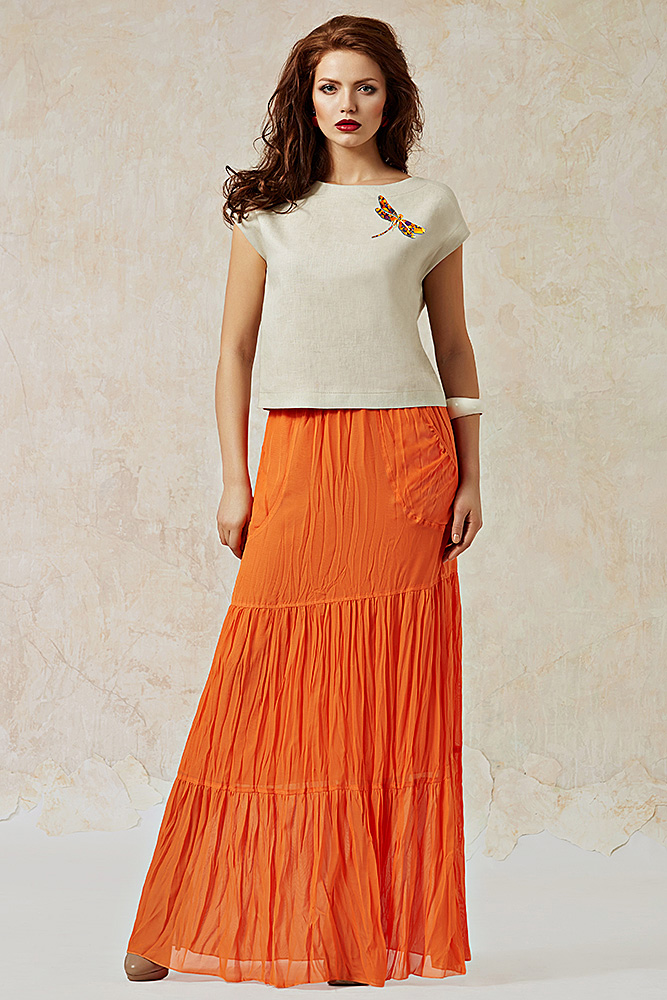 Свободного кроя, укорочённая льняная блузка со спущенным плечом и декором в виде стрекозы. Декор-съемный. Горловина округлая.