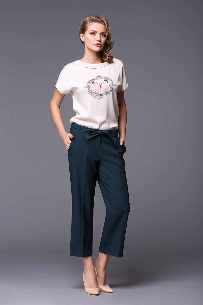 Нежная женственная блуза с изумительной печатью "бабочка", украшена мерцающими стразами. Рукавчик втачной, горловина округлая с отложным воротничком. Укороченные широкие брюки-кюлоты ультрамодного силуэта. Выполнены из костюмной поливискозной ткани. Кюлоты с боковыми карманами и на притачном поясе со шлёвками.