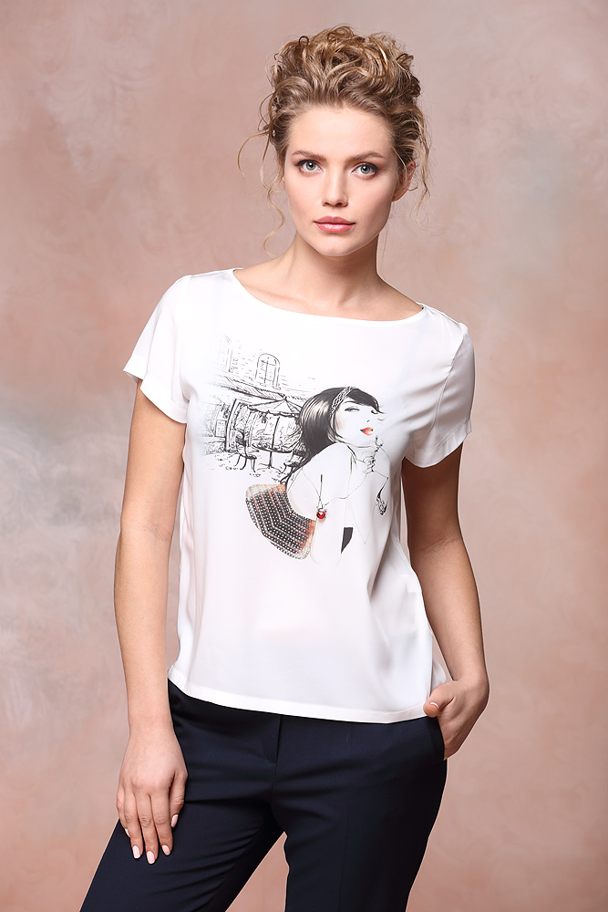 Милая блузочка с коротким втачным рукавчиком дополнит любой костюм. Авторский принт "Девушка с сумочкой" выглядит очень эффектно.