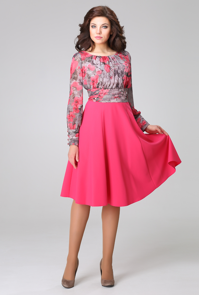 Платье полуприлегающего силуэта, отрезное по линии талии. Длина по среднему шву спинки 105 см( доп. погр. 1-2 см). Лиф со сборкой. выполнен из шифона. Юбка расклешённая из 6 клиньев. Пояс и манжеты выполнены с эффектом <<крэш>>. Манжеты на застёжке на 4 навесные петли и пуговицы. В среднем шве спинки потайная молния. Платье на подкладке. Ткань плательно-костюмная + шифон.