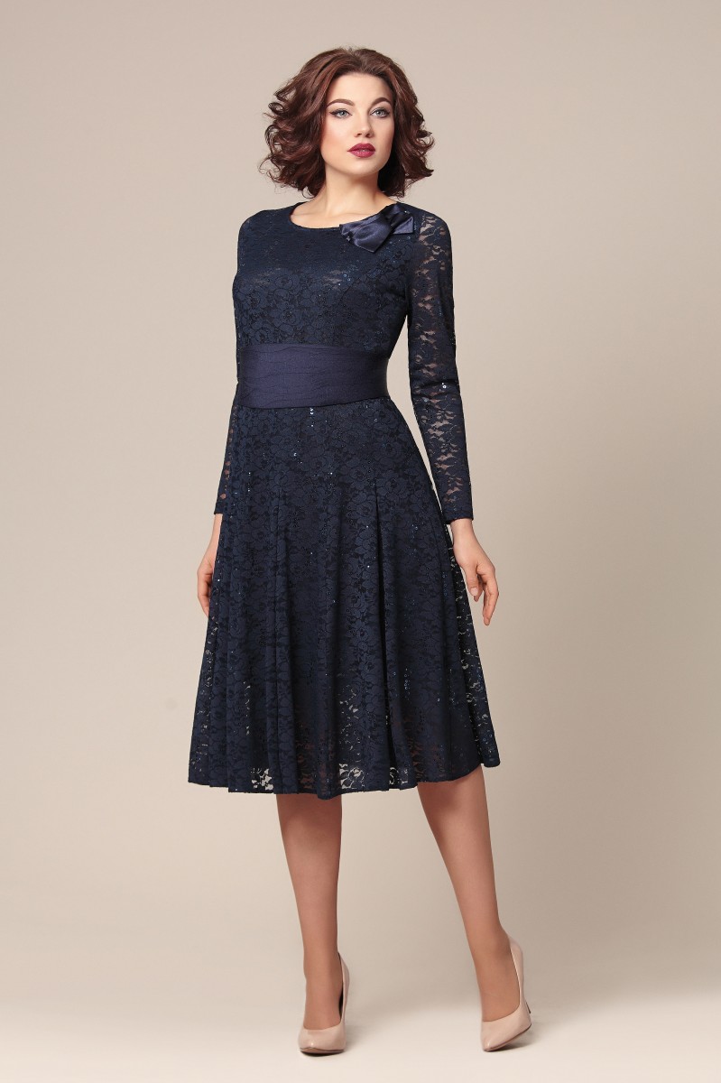 Платье на трикотажной стрейчевой подкладке, отрезное по талии, юбка с бантовыми складками. Длина по спинке 109- 110 см. в зависимости от размера (доп. погр.1-2 см. ). Пояс с эффектом "крэш" и отделка по горловине из ткани компаньона. В среднем шве спинки потайная молния. Ткань: гипюр-стрейч с натуральными волокнами, отделка-сатин.