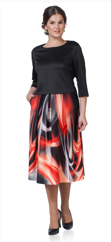 Джемпер полуприлегающего силуэта, с центральным швом по переду. На спинке короткая декоративная молния в верху. Рукав втачной, спущенная линия плеча. Длина по спинке 44-45 см. (доп. погр.1-2 см. ). Юбка со встречными складками на притачном поясе и карманами в боковых швах. Длина юбки 79 см. Ткань: трикотажное полотно