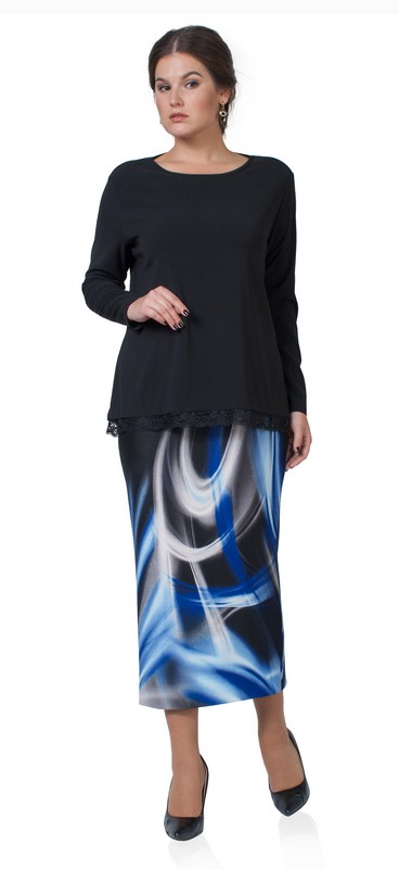 Джемпер прямого силуэта. Длина по спинке 69-70 см. в зависимости от размера (доп. погр.1-2 см.). Низ джемпера декорирован кружевом. Юбка заужена к низу, сзади разрез. Длина юбки-95 см. Ткань: трикотажное полотно