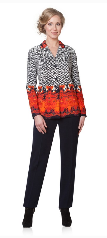 Жакет полуприлегающего силуэта, на подкладке. Длина по среднему шву спинки 66 см. (доп. погр.1-2 см. ). Длина рукава 62.8 см (доп. погр. 1-2 см.). Брюки прямые классические с притачным поясом. Длина по боковому шву 102-103 см. (доп. погр.1-2 см. ). Ткань: плательно-костюмная.