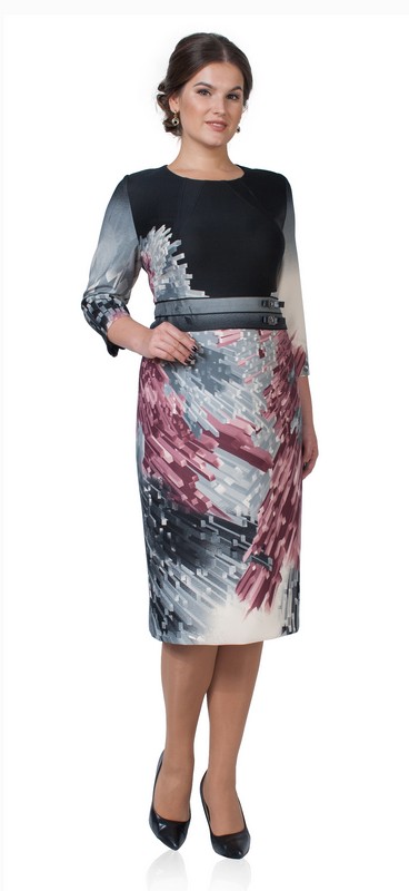 Платье полуприлегающего силуэта. Длина по среднему шву спинки 109 см (доп. погр.1-2 см). Перед платья с отрезным лифом и притачным поясом (отделка- кант). На левой части пояса - 2 декоративных элемента. В боковых швах разрезы. Ткань: трикотажное полотно.