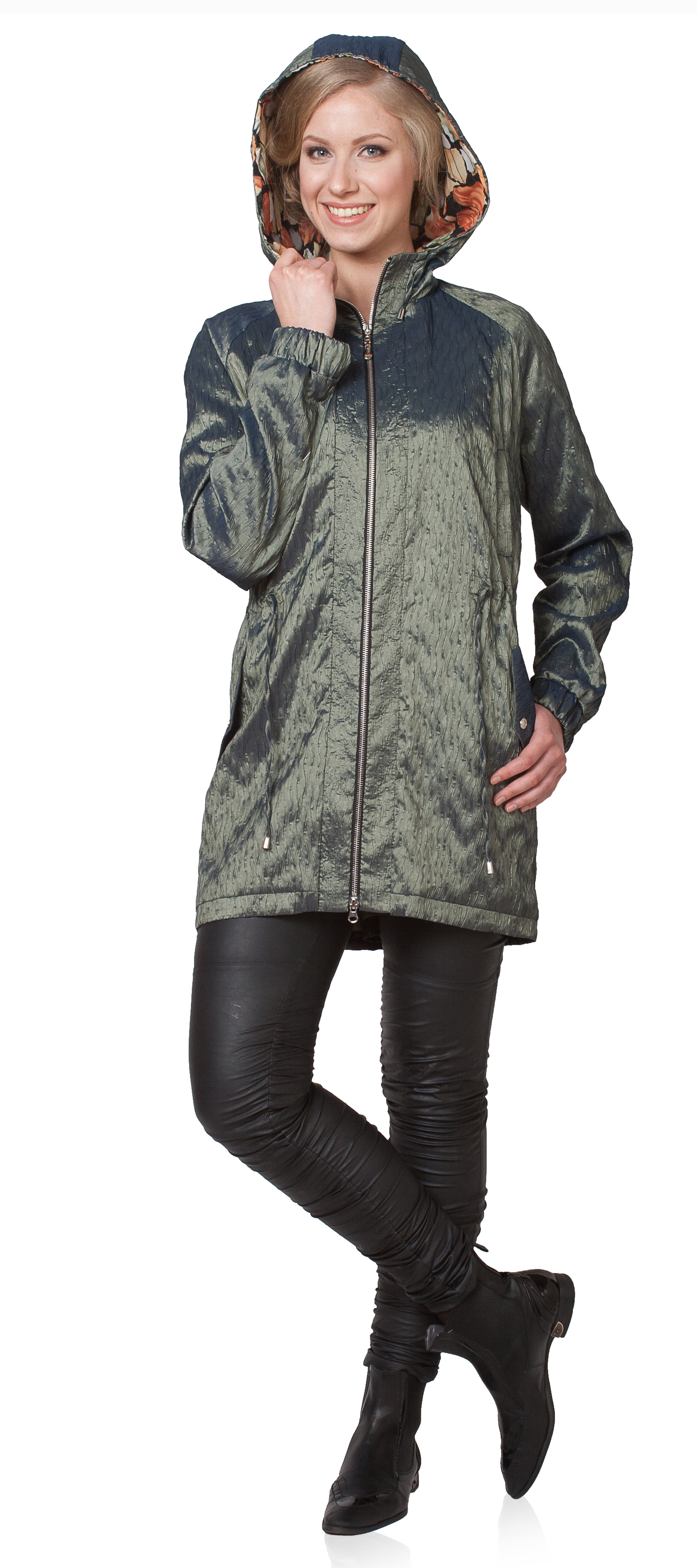 Куртка - парка прямого силуэта на подкладке с капюшоном, внутренняя часть капюшона ткань шелк. Длина по спинке 85 см. (доп. погр. 1-2 см.). Рукав- реглан, манжеты собраны на резинку. По переду 4 прорезных кармана. Застежка на тесьму молнию. По среднему шву спинки шлица с застежкой на кнопках. Ткань: крэш/тафта + шелк.