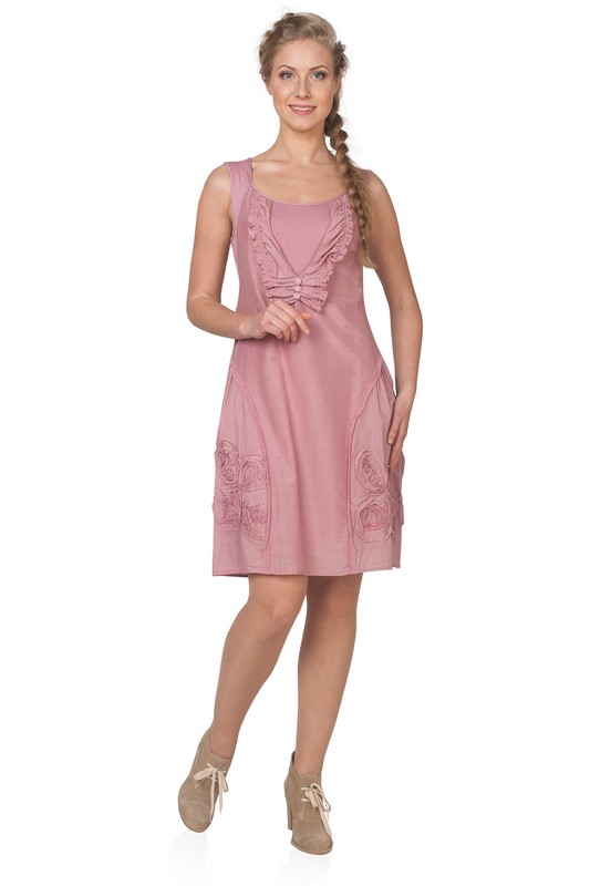 Л -720 платье-туника прямого силуэта. Длина по спинке 96 см (от шейной точки). Платье выполнено из двух слоёв разных фактур. Нижний слой из трикотажного полотна с натуральными волокнами, верхний - из тонкой натуральной ткани (хлопок + шёлк). На переде декоративный воротник с эффектом <<крэш>>на боковых сечениях и воротнике отделка тканью-сеткой.