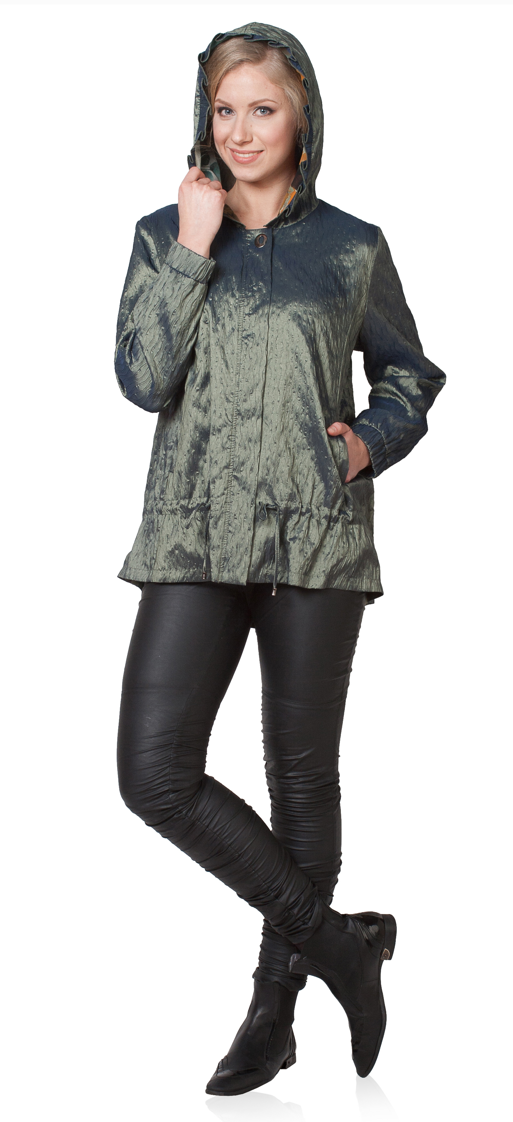 Куртка прямого силуэта, на подкладке. Длина по спинке 76-78 см. в зависимости от размера ( доп. погр. 1-2 см.). Перед с застежкой на молнию, закрывающуюся на планку, верх планки застегивается на кнопку. Вертикальные карманы с листочкой. Капюшон декорирован отделочной деталью со складками, внутренняя часть капюшона выполнена из шелка. Манжеты рукавов собраны на резинку. Ткань: крэш/тафта + шифон.